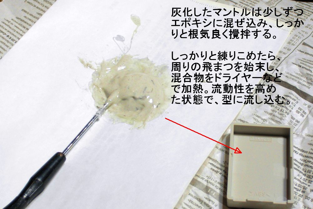 ランタンマントルを圧縮・高密度化・形状安定すると、一定の放射出力の安定が得られることは分かったが、いかんせん線源の密度が低く、点線源には程遠いものがある。そこで、マントルを本来の運命どおりに燃焼・灰化し密度を上げ、樹脂練りこみとして出力安定を図ってみた。