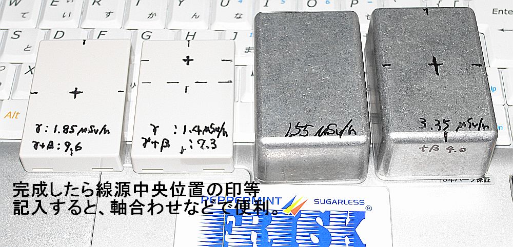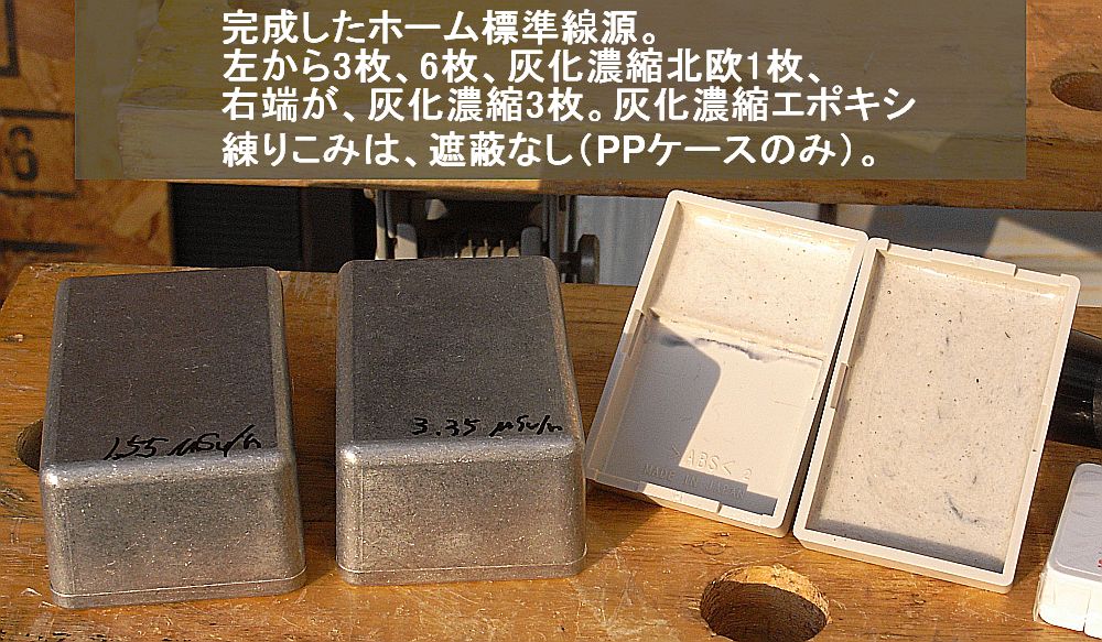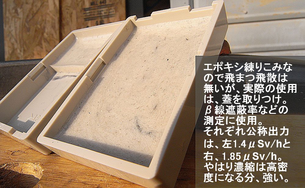 同じ内容で(詰め込み方は故意に強い弱いをつけて)4個製作してみましたが、いずれの場合でも1.53μSv/h(SBM-20×2、鉄鉛遮蔽で450CPM)~1.59μSv/h(同477CPM)となりました。(定確度1000カウント)およそ1.5μSv/h ±10%以内に再現されるのではないかと考えています。