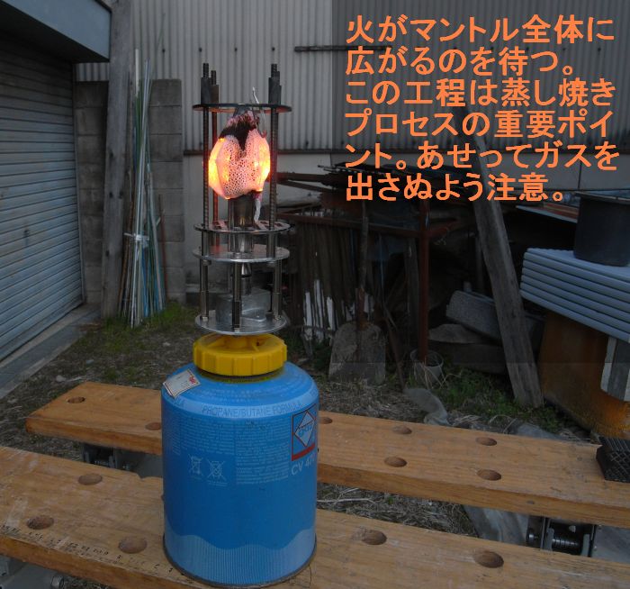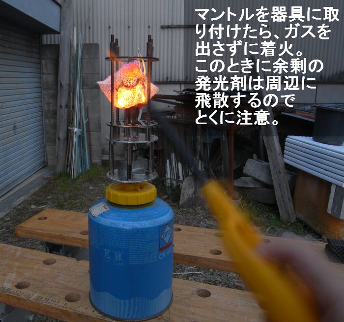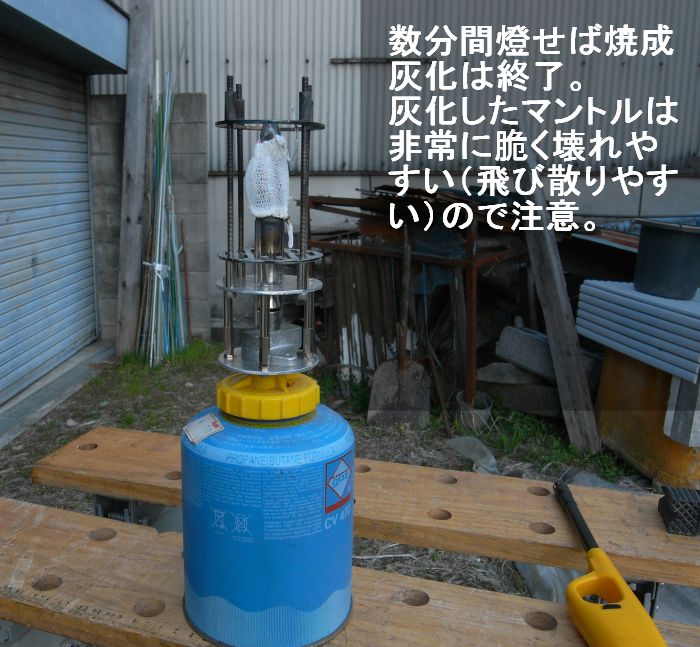 ランタンマントルは、ランタンの燃焼塔に取り付け、蒸し焼き無機化し、還元炎中で炎色発光させる。