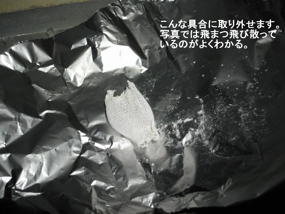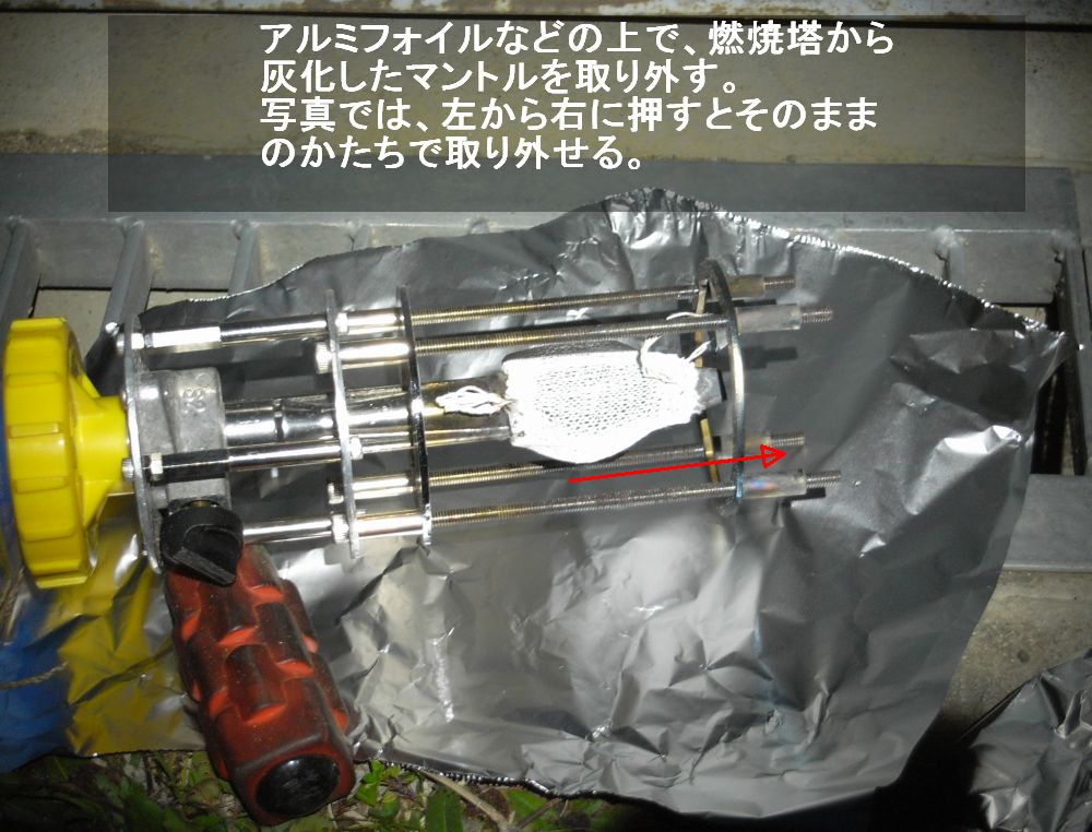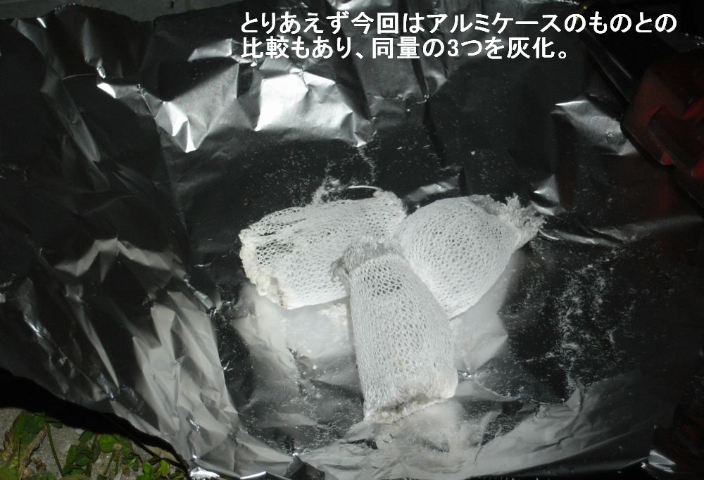バーナーなどで燃焼させてみたが、ランタンに取り付けて燃やした場合と異なり、生焼け状態で、繊維質が多く残り、おそらく絹から生じたと思われるタール分などの残量が多く、あまり好ましい結果にならなかった。