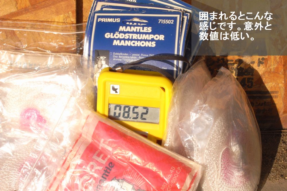 ポリ袋に入れる理由は、ランタンマントルからの放射性物質の漏出や付着を嫌うためで、実際に裸でガイガー管に接触させていると、次第に計数下限が上昇(汚染)されていくことが確認される。